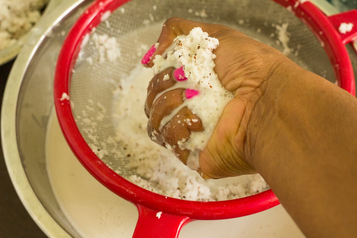 - Pour coconut mixture into the strainer and work as much liquid out of the coconut as possible.